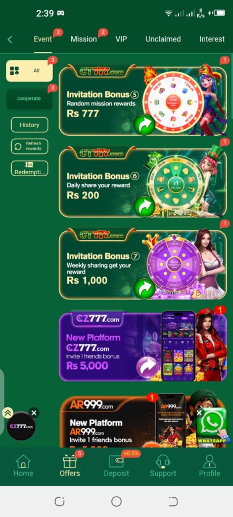 The referral option allows users to invite friends. When friends join and play, rewards appear in the account. This system helps players grow earnings while enjoying the platform together.
